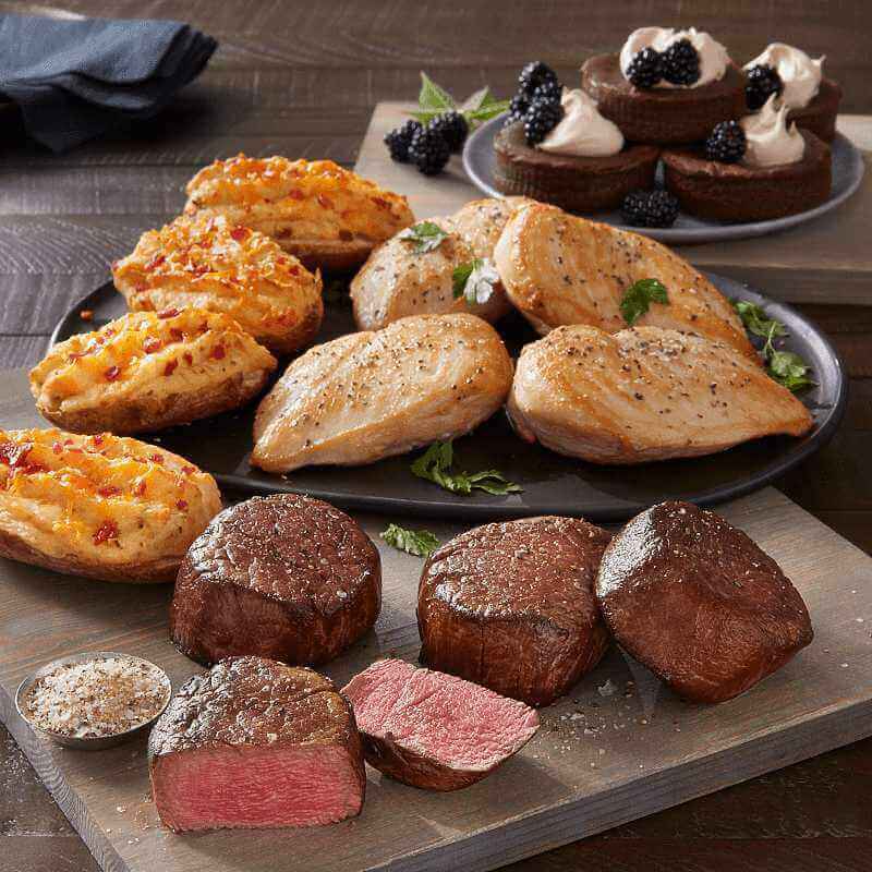 An exceptional steak dinner that's perfect for smaller family gatherings. Four Super Trimmed™ Filet Mignons, four Boneless Chicken Breasts and four Twice-Baked Potatoes loaded with Cheddar Cheese and Bacon add up to one festive feast any day of the week.